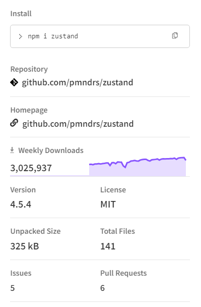 - Zustand: Redux와 비교하면 훨씬 간단하고, 매우 작은 크기의 상태 관리 라이브러리입니다. 상태 변경을 추적하거나 전역 상태를 쉽게 설정할 수 있으며, 불필요한 리렌더링을 방지하는 등 성능 최적화에도 도움이 됩니다.
